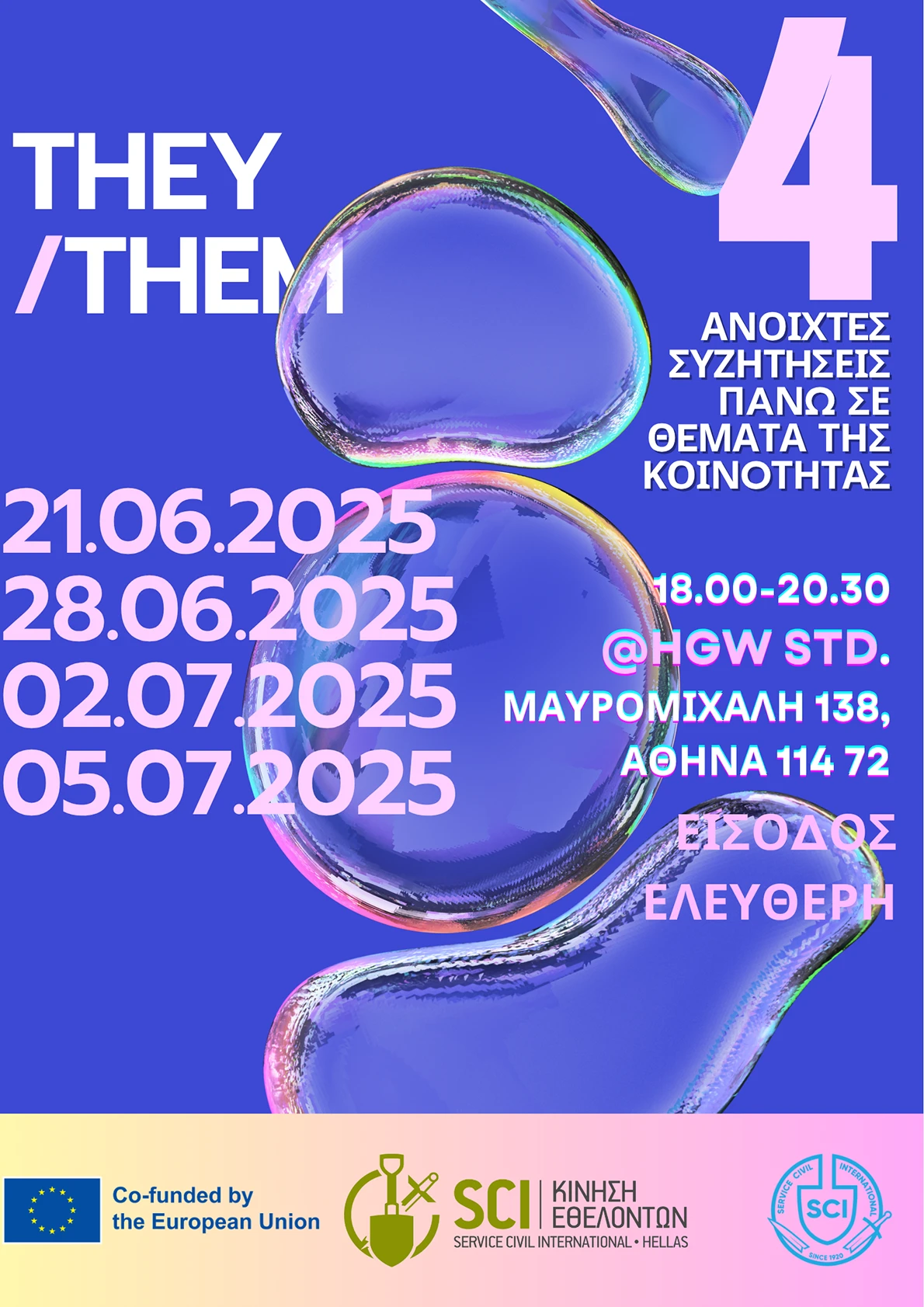 Η SCI Hellas, με την υποστήριξη της Ευρωπαϊκής Ένωσης στο πλαίσιο του προγράμματος RE-granting, διοργάνωσε μια σειρά από ανοιχτές συζητήσεις με τίτλο “They/Them” (a series of discussions on LGBTQIA+ matters), που στόχο είχαν τη δημιουργία διαλόγου, έκφρασης και αναστοχασμού γύρω από ζητήματα LGBTQIA+ ταυτοτήτων, γλώσσας και αυτοπαρουσίασης.